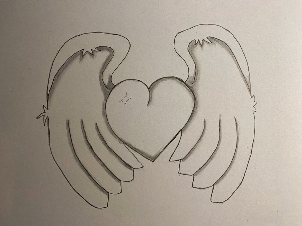 This heart with wings sketch is my starting point, symbolizing love and freedom.
