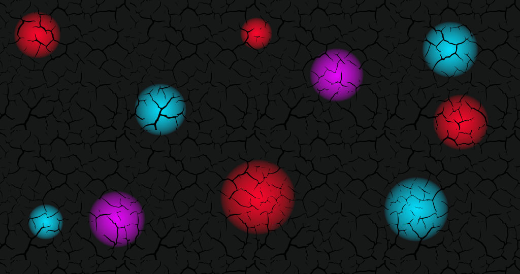 A vibrant and playful desktop wallpaper showcasing glowing orbs in red, blue, and purple against a dark cracked surface.