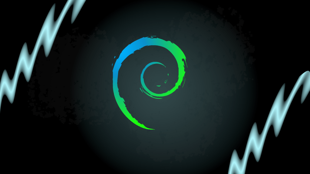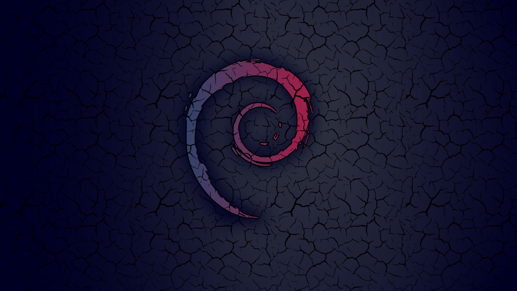 An abstract and edgy Debian-inspired desktop background featuring the iconic Debian swirl set against a cracked, dark surface with vibrant red and blue streaks.