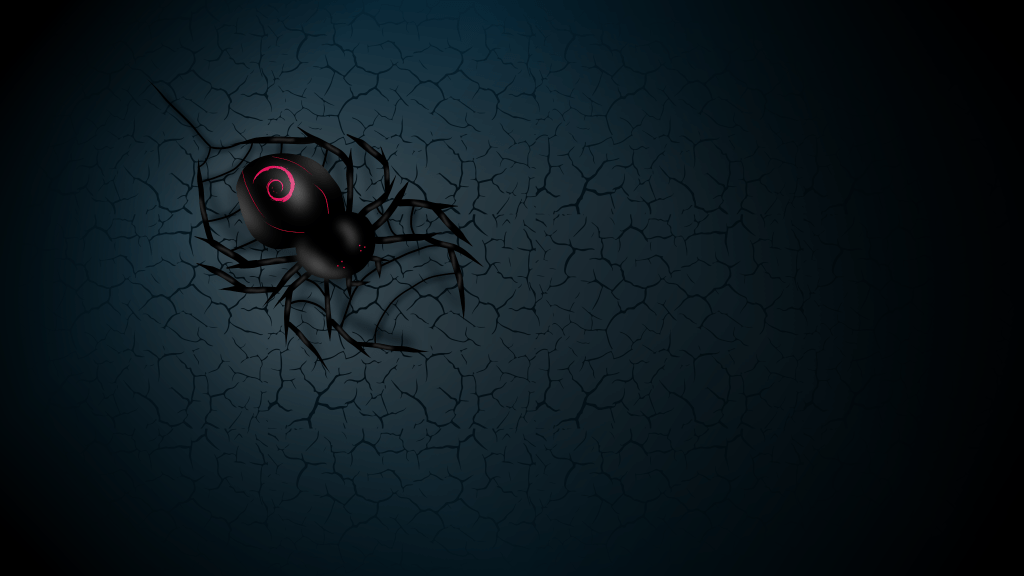 Debian-themed spider crawling on a dark, cracked surface, exuding an eerie tech vibe.