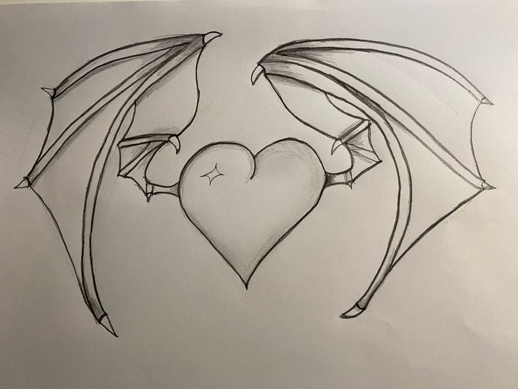 A heart with bat wings, symbolizing darker love or an emotional contrast in this sharp, edgy sketch.