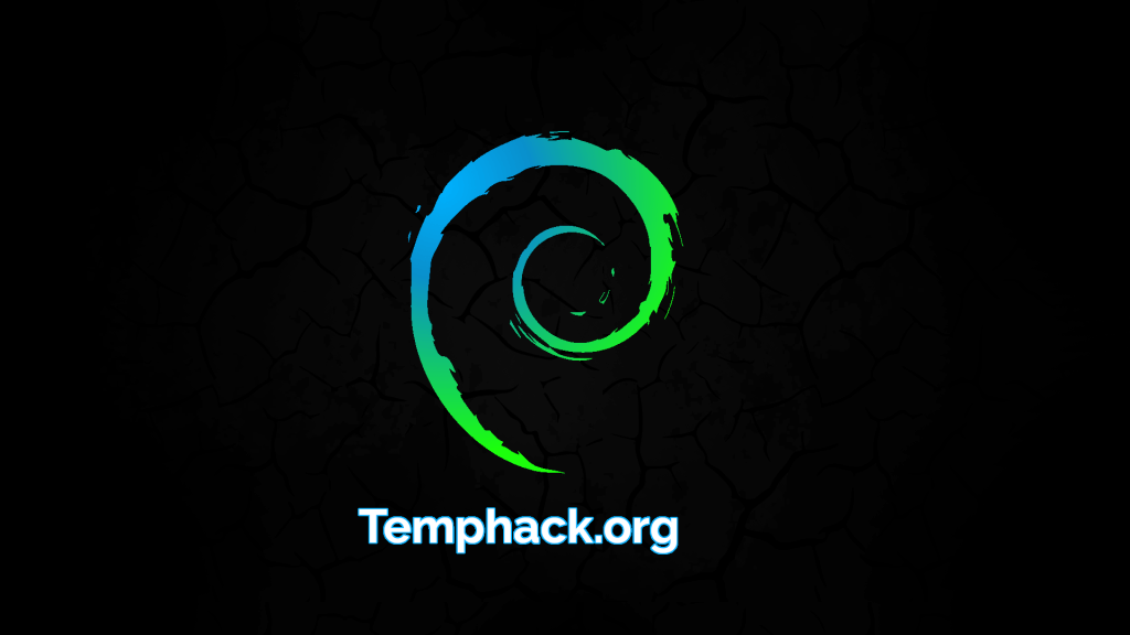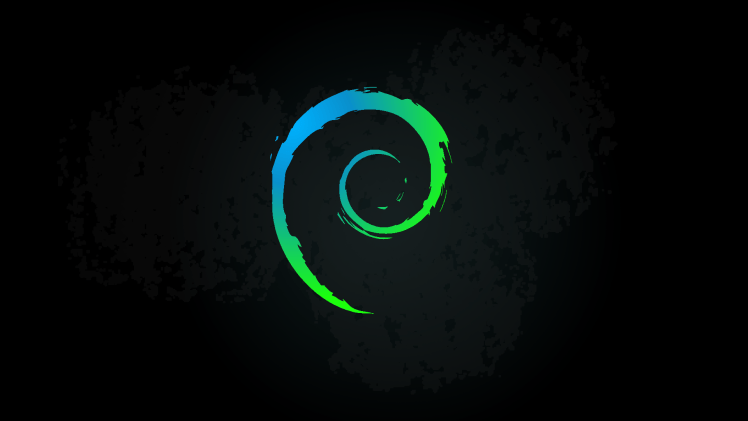 Red Debian swirl on a dark, cracked, and moody textured background.